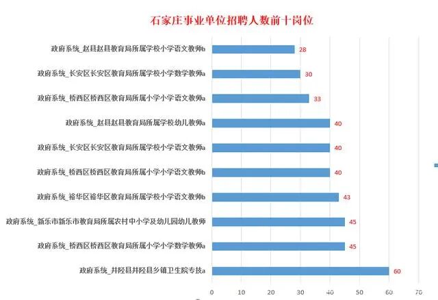 其中排在前三的为政府系统_井陉县井陉县乡镇卫生院专技a、政府系统_桥西区桥西区教育局所属小学小学数学教师a、政府系统_新乐市新乐市教育局所属农村中小学及幼儿园幼儿教师,招聘人数在45人以上!!!