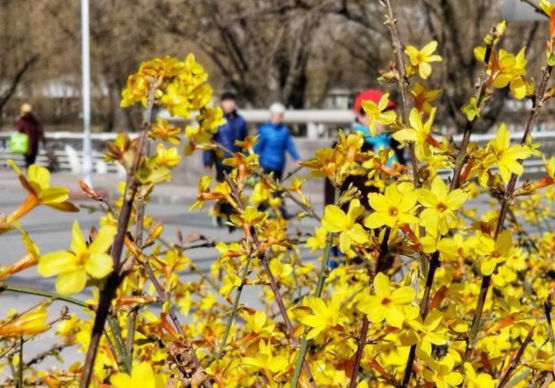 四、连翘。落叶灌木,小枝黄色拱形下垂,中空。花冠黄色,四瓣,开花比迎春晚,满枝金黄,艳丽可爱。早春先叶开花,花开香气淡,满枝金黄。花期:3月中旬至4月初。