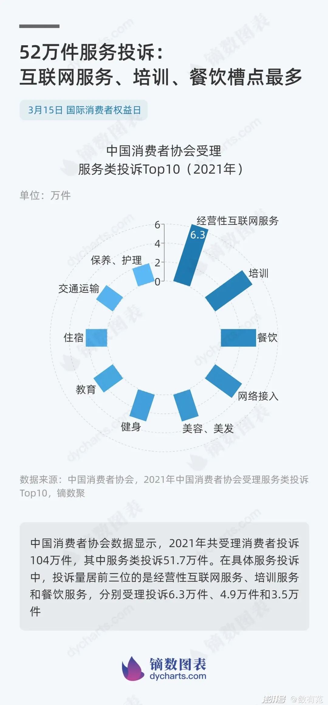 中国消费者协会数据显示,2021年共受理消费者投诉104万件,其中服务类投诉51.7万件。在具体服务投诉中,投诉量居前三位的是经营性互联网服务、培训服务和餐饮服务,分别受理投诉6.3万件、4.9万件和3.5万件。
