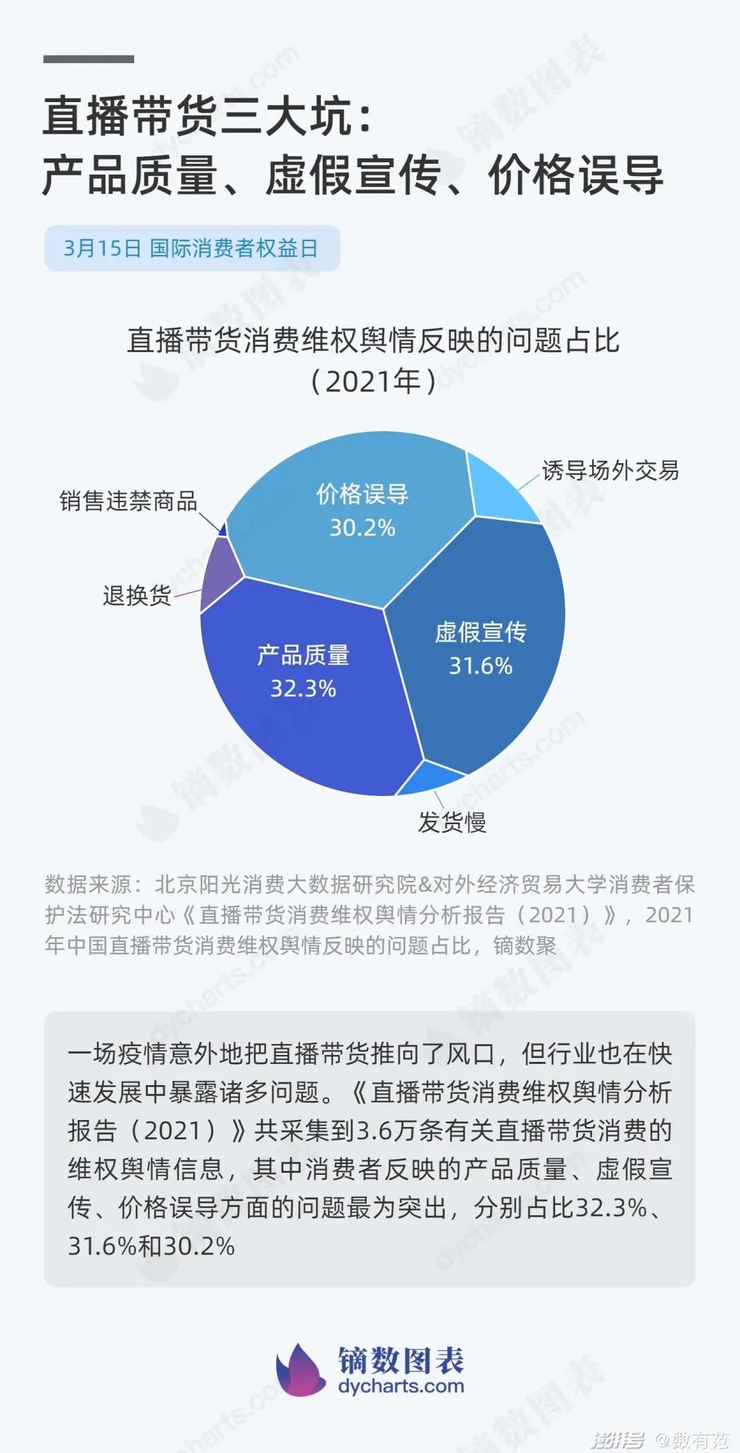 一场疫情意外地把直播带货推向了风口,但行业也在快速发展中暴露诸多问题。《直播带货消费维权舆情分析报告(2021)》共采集到3.6万条有关直播带货消费的维权舆情信息,其中消费者反映的产品质量、虚假宣传、价格误导方面的问题最为突出,分别占比32.3%、31.6%和30.2%。文章来源澎湃新闻